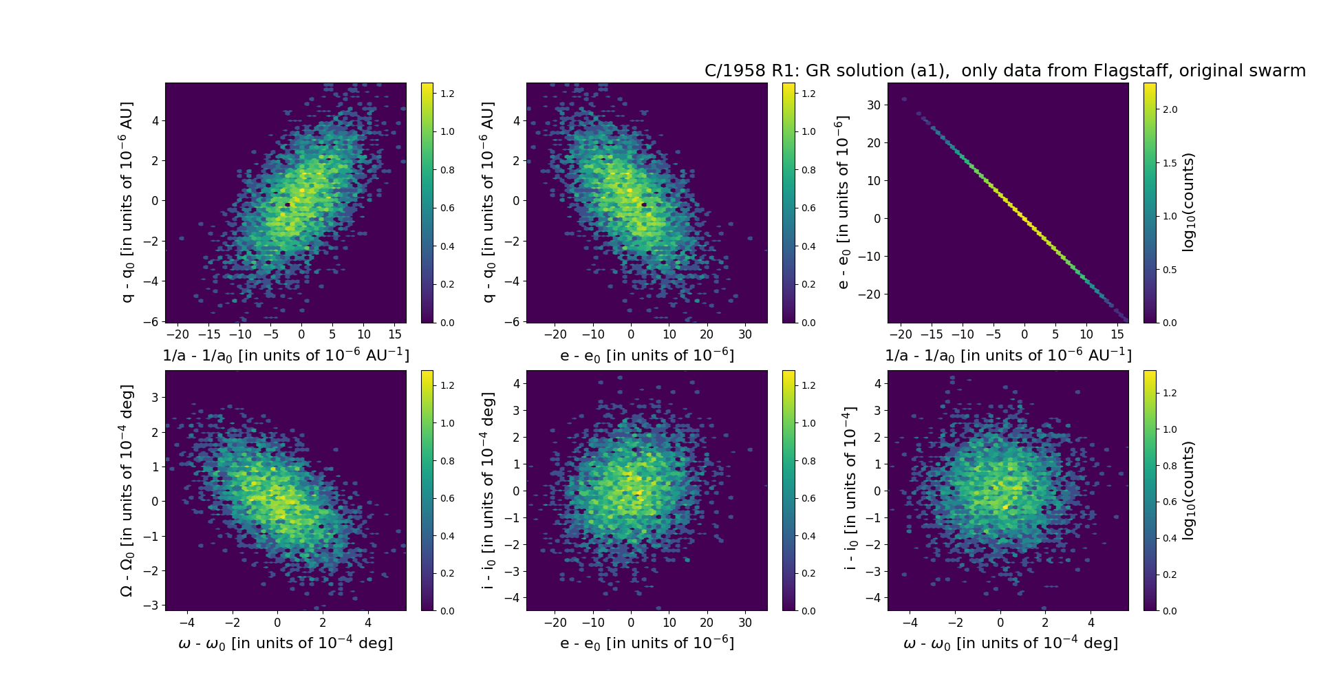 Six 2D-projections of the 6D space of original swarm including 5001 VCs. Each density map is given in logarithmic scale presented on the right in the individual panel.