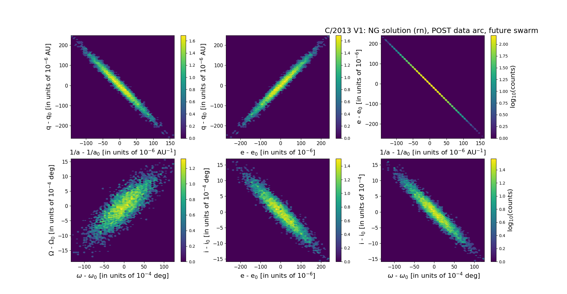 This is a comet with NG effects strongly manifested in positional data fitting. Solutions 'a5' and 'n5' (preferred) are based on data spanning over 1.2 yr in a range of heliocentric distances: 2.70 au – 1.661 au (perihelion) – 3.69 au. GR solution 'ba' differ from 'a5' in the method of data weighting, silimarly the pair of NG solutions 'bn' and 'n5'.