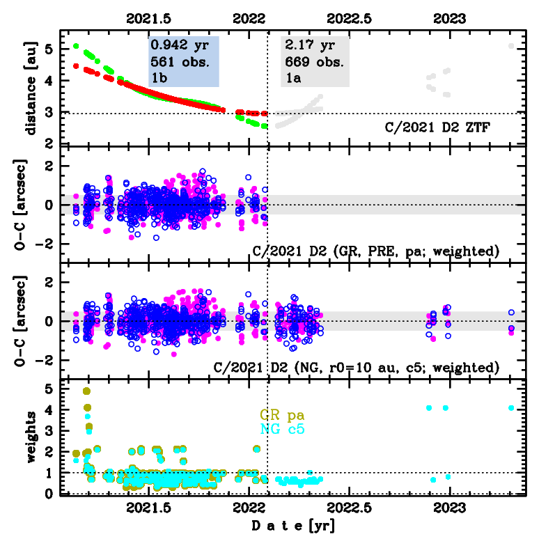 Comet C/2021 D2 was discovered on 19 February 2021 by Palomar Mountain--ZTF, that is almost a year before its perihelion passage.
